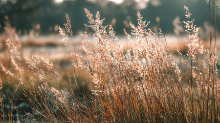 An enchanting view of golden grass swaying in the early morning light. Soft bokeh and delicate dewdrops add a serene touch, perfect for nature lovers.