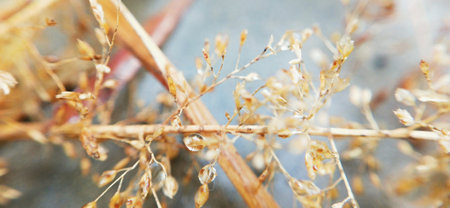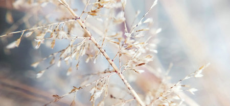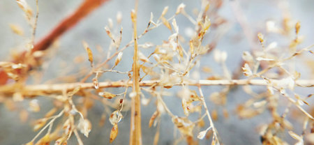 Dehydrated dry plants in wabi-sabi style and sandy, champagne tones. Web banner backdrop for text copy