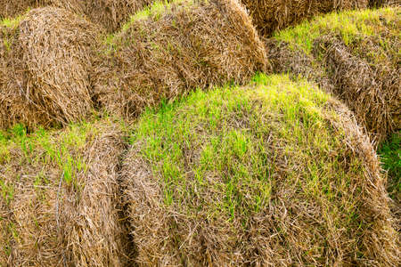Hay texture. Bales of hay are stacked in large piles. Harvesting in agriculture.