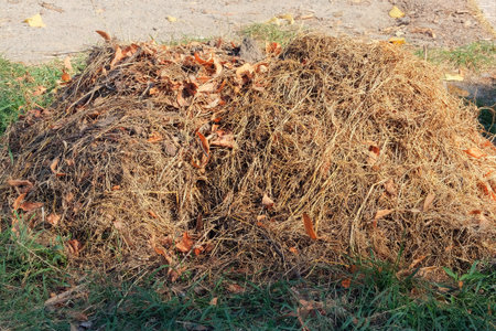 Dry grass is collected in garden. Hay for mulch is collected for use in gardening.