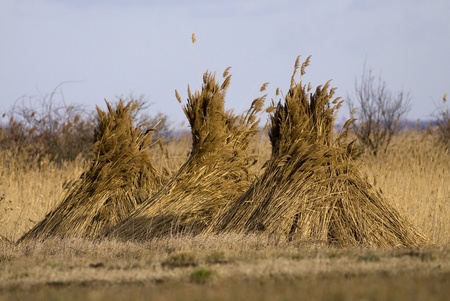 Straw stacks on an oblique field against the sky