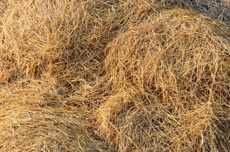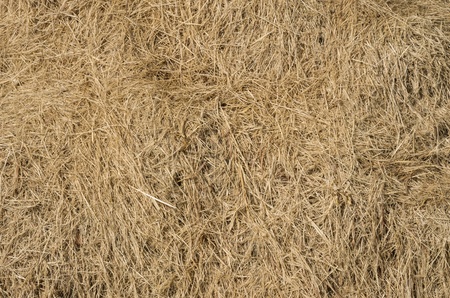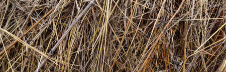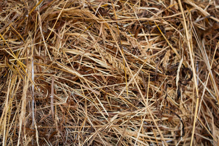 Rural agriculture objects and details concept. Detailed closeup dry of scattered hay