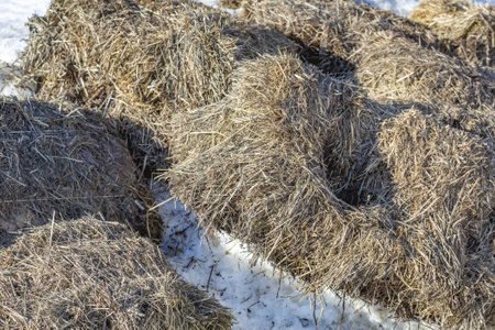 Dry straw and grass stalks on an agricultural farm for livestock feed
