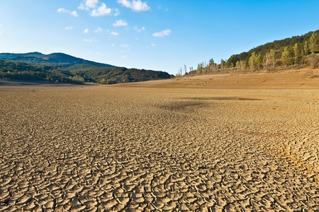 Dry and cracked earth in the reservoir at Sau reservoir, Catalonia