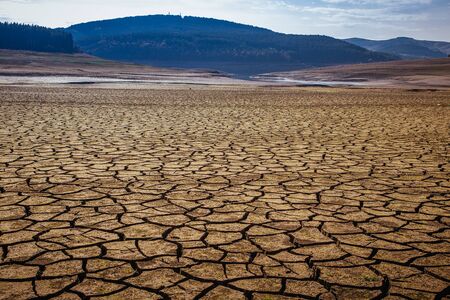 Climate change, land with dry and cracked ground in Spain. Soil drought landscape. Water crisis, cracks earth near drying water. Waterless ground. Natural disasters desert background