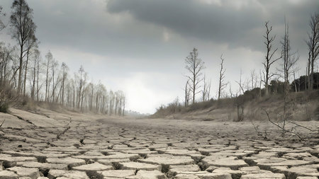 Cracked earth stretches across the landscape, showing severe drought conditions under a radiant sun.