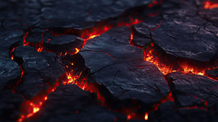 A Dramatic volcanic lava flow with glowing red and black textures creates mesmerizing and intense natural scene