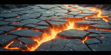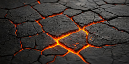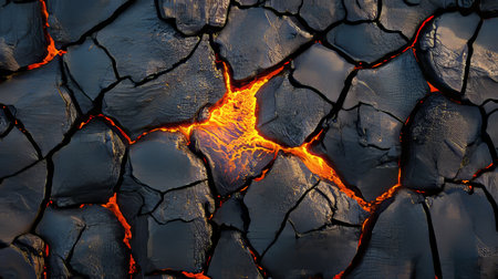 Cracked earth with glowing lava fissures, abstract background.