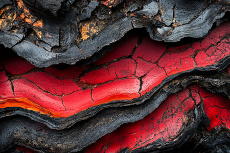 Abstract molten stone texture, dynamic red and black layers with visible heat emanating, intense and dramatic