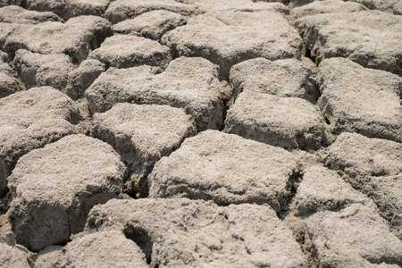 The surface of dry land with many cracks. Ground surface peel off from hot temperature.