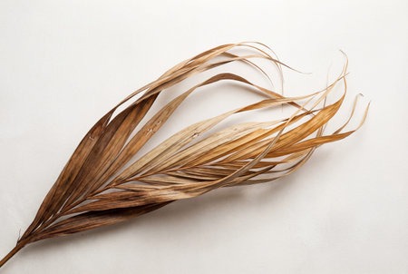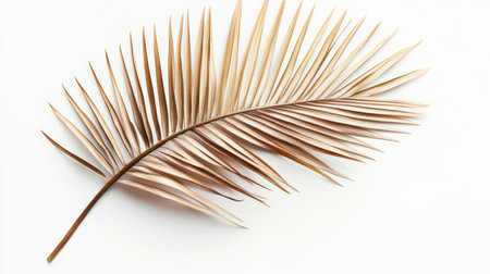A dry palm leaf is elegantly placed on a light textured surface, highlighting its intricate shapes and warm golden tones. The composition emphasizes natural beauty and simplicity.