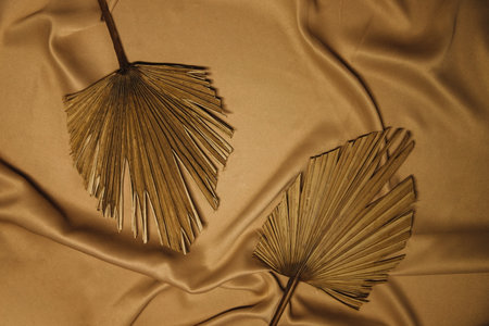 On the folds of the beige fabric are dry palm leaves. Natural and fashionable colors.Trend of the year.Background and texture.