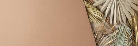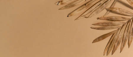 Dry palm leaves on a beige background. Background for advertising your product. Creative copy space for your design. Abstract natural texture. Banner