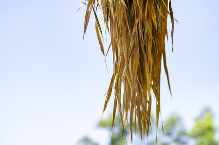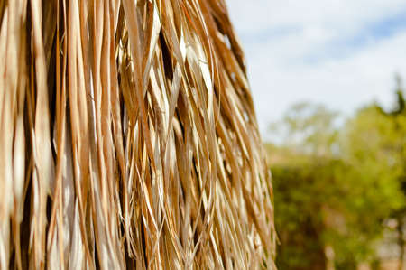 Roof of the ritual Sukkah of palm leaves, Israel. Dry brown palm leaves. Dried fan shaped tropical palm tree branch. Roof covered with dry palm leaves. Hut for the religious Jewish holiday of Sukkot