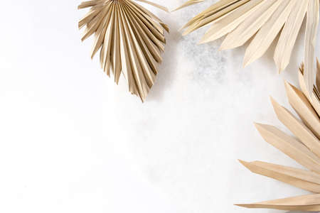 Dry palm leaves on a white background. Flat lay. Top view. Copy space