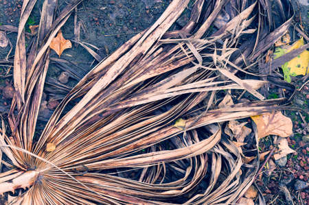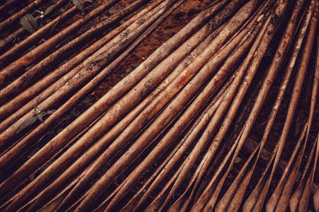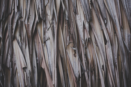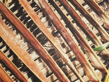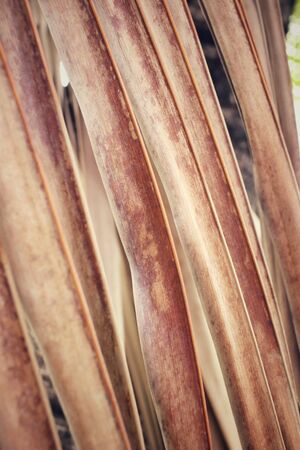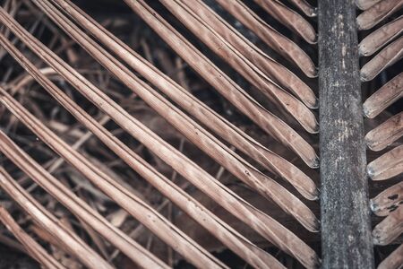 Old dry palm tree leaves textured natural organic outdoors background, close up grunge detailed photography. Environment aging forestry plantation protection. Weathered wooden surface design