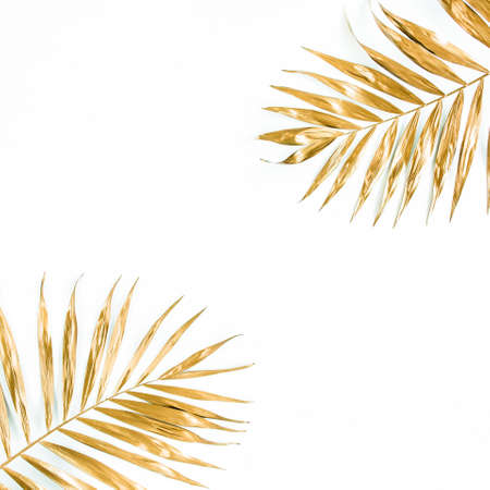 Gold tropical palm leaves on white background. Flat lay, top view minimal concept.