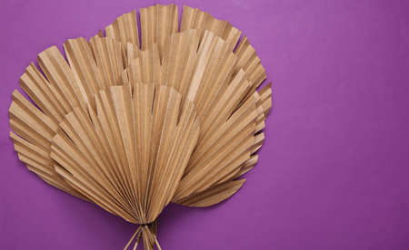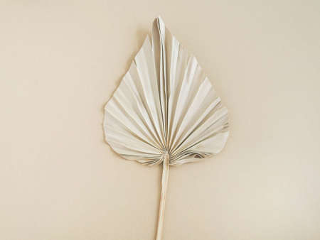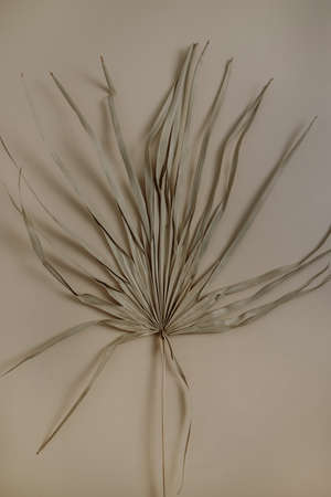 Dry palm leaf on beige background. Close up of dried fan shaped tropical palm tree leaf. Natural background