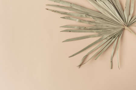 Dry tropical exotic palm leaf on pale pastel peachy background. Minimalist floral pattern aesthetic composition. Summer time concept.