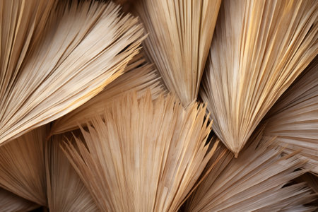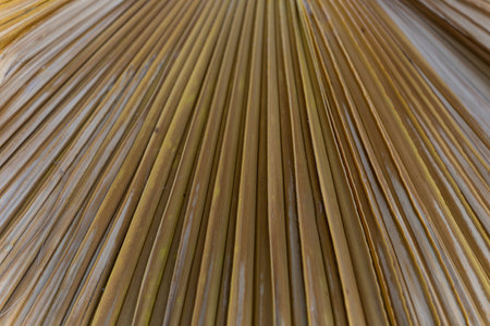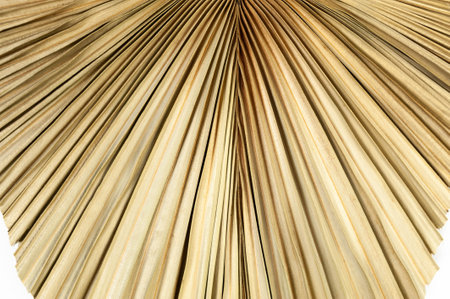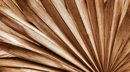 A close up of dried palm leaves arranged in a fan pattern. The texture highlights the natural lines and grooves, creating a rhythmic and repetitive design. Ideal for backgrounds. Palm tree branch leaf