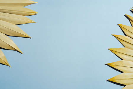 Dried palm leaves in a fan on a blue background. Summer in tropical with seaside destination background