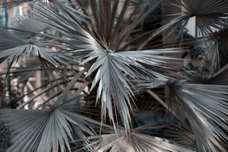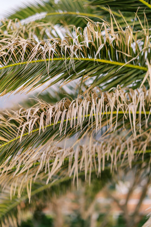 Dry yellow palm leaves in a sunlight. Summer background. Selective focus.