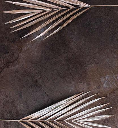 Tropical natural background with palm leaf on brown. Flat lay, copy space
