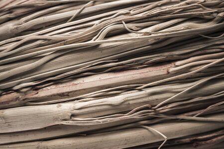 Straw broom texture. Macro shot of straw. Background image of a hay structure. Close shot.