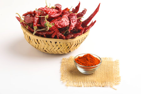 Red Chilly Powder in a bowl with dried red chillies over colourful background or pile of red chilli powder over plain background