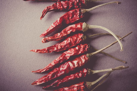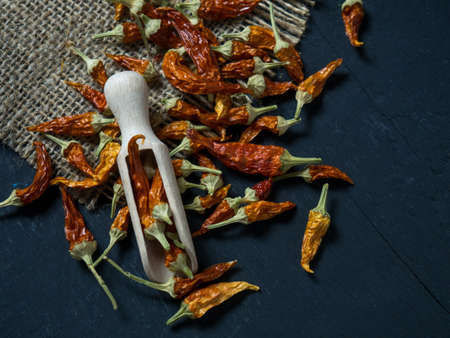 Dried vibrant hot peppers, food background with copy space