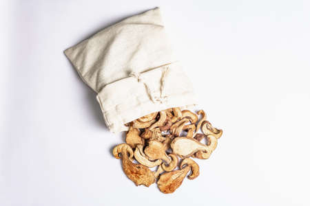 Forest dried edible mushrooms in a linen sack isolated on white background. Dehydrated slices, exquisite ingredient for cooking healthy food