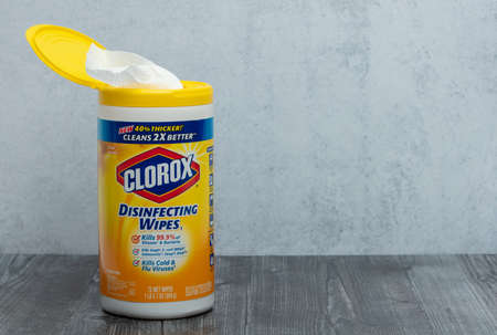 Houston, TX - May 6, 2020: A closeup of an isolated new package of Clorox disinfecting wipes on a wooden table.