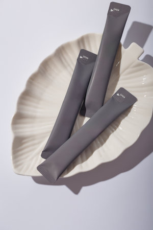 Some gray cosmetics sticks on leaf shaped plate and white background. Hair repair mask mockup, unbranded template, no label. Copy space.