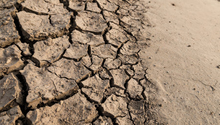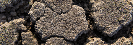 Close-up of parched earth with deep cracks caused by lack of moisture, rich texture and earthy tones under bright sunlight