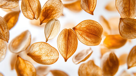 A beautiful display of delicate brown seeds floating softly in the air, showcasing their intricate textures and organic forms in a serene backdrop, perfect for nature-themed projects.