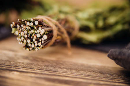 A dry birch broom lies on a wooden background. Accessories for baths and saunas. spa treatments. Natural, eco-friendly materials.