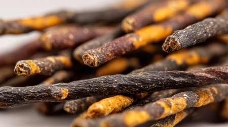 Dog food pattern made with dry snacks sticks. Flat lay texture in brown earthy tones. Home pets, animals feeding. Special diet, training supply. Top view background.