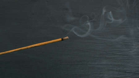 Burning indian incense aroma sticks with smoke on black stone background. Fragrant smoky sandalwood stick top view