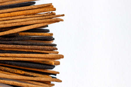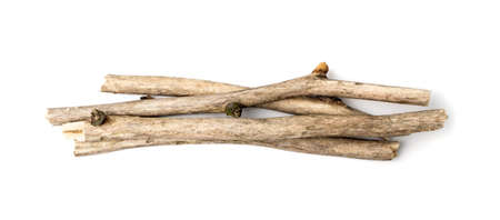 Natural toothbrush Miswak (Kayu Sugi) on white background with selective focus. It is a teeth cleaning twig made from the Salvadora persica tree and also know as miswaak, siwak, Sugi or sewak