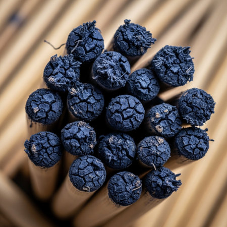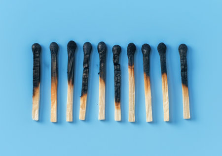 burnt matches arranged on a blue background, focus on charred tips and wooden stems, creating a striking visual contrast with the soft color mood