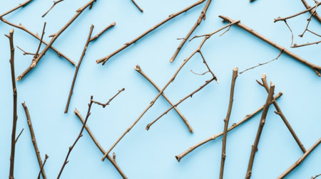A captivating arrangement of twigs set against a soft blue background. Perfect for showcasing natural elements in design, art projects, or crafting.