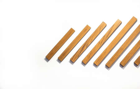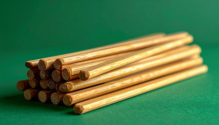 A neat pile of natural wooden dowels rests against a rich green background. The simple, clean arrangement evokes a sense of order, potential, and natural materials, perfect for concepts of building, crafting, or foundational elements.