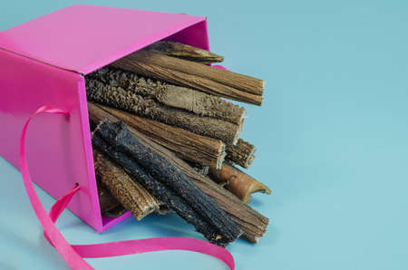 Box of treats on a blue background. Dried dental goodies for puppies, adult dogs and seniors dogs. Delicious Beef Sticks Stomach. Bovine tripe.Gift Box.