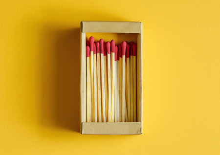 matches, box, yellow background, red tips, fire starter, safety matches, minimalist concept, stationery item, creative composition, close up photography