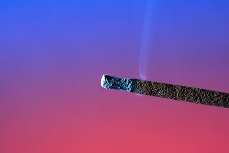 Burned match in the coals on Lush Lava background. close up copy space