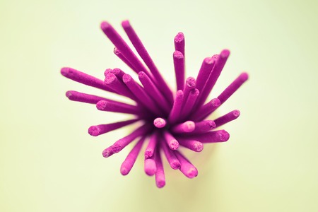 Purple indian incense aroma sticks on light background close up top view