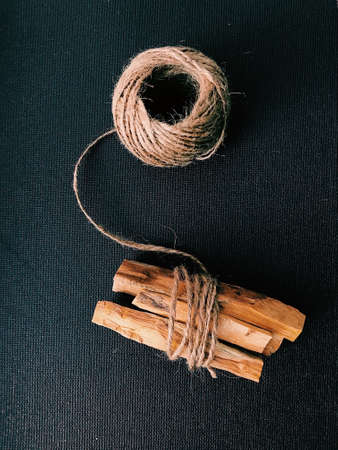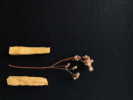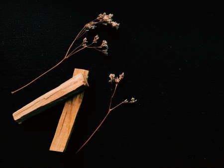 Scattered sticks of Palo Santo tree on a dark background. Top view. Organic holy tree incense from Latin America. Color photo close-up of natural frankincense.