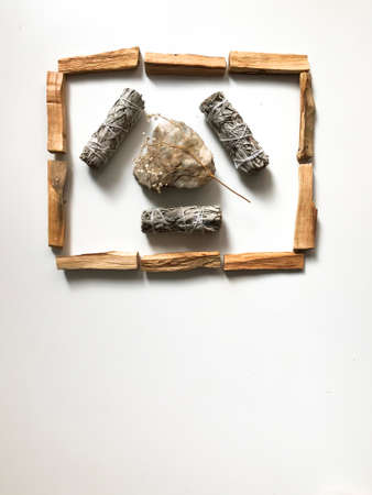 Natural incense White Sage and Palo Santo. Sacred tree of South America, color square photo. White Sage and Palo Santo on white background.