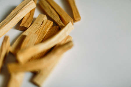 bunch of wooden palo santo sticks on a neutral background. soft focus, macro frame