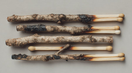 A captivating arrangement of natural twigs paired with wooden matches, showcasing texture and earthy tones ideal for creative projects or fire safety materials.